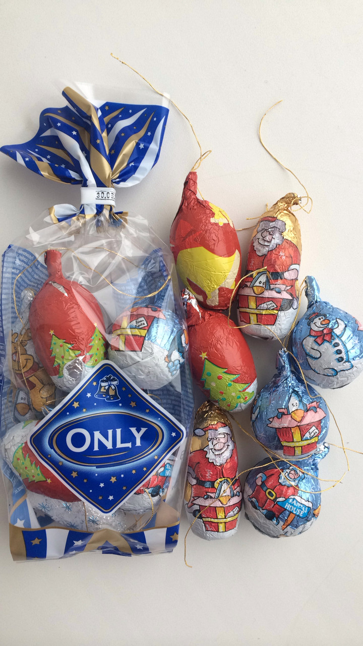 Набір шоколадних іграшок на ялинку – прекрасна прикраса, а головне, що їх можна діткам з’їсти. В наборі 7 шоколадних кульок ( 5см*5см) загорнутих в блискучу фольгу, на якій зображені місяць і зірочки. Вгорі кулі є золотисті ниточки, за які вони вішають на ялинку і не тільки…ними можна прикрашати святковий стіл…торти…десерти…і т. д….наскільки багата ваша фантазія… з наступаючими вас святами…гарного настрою…