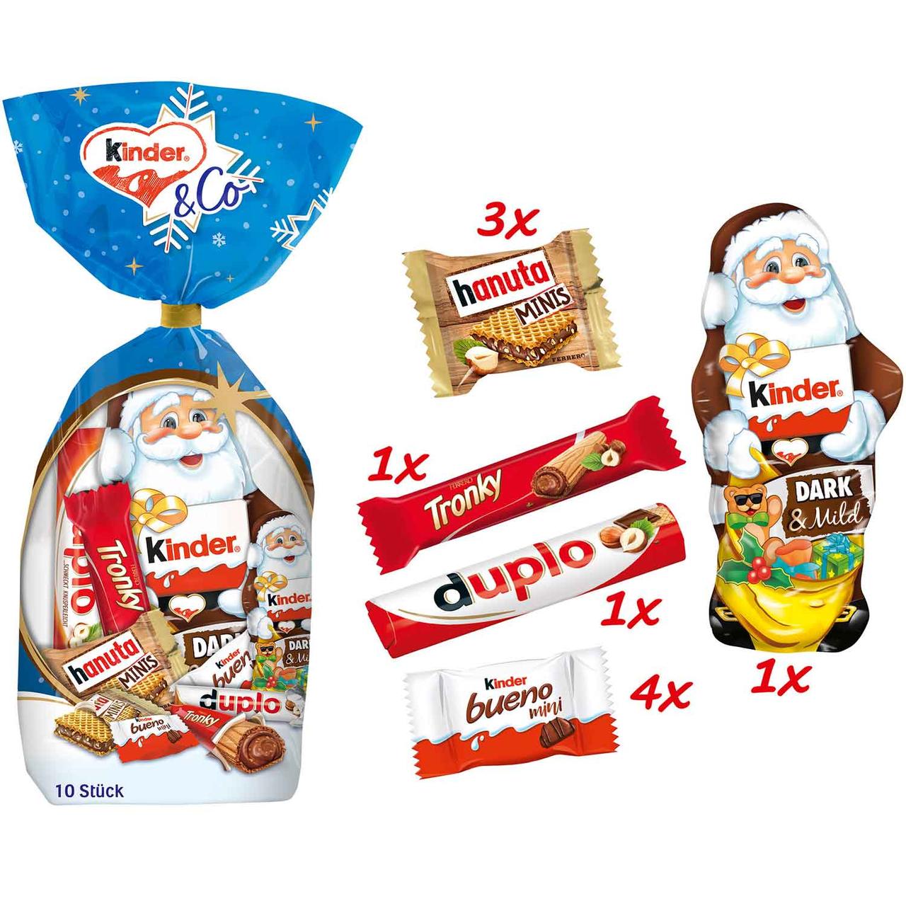 Шоколадний новорічний набір Санта-Клаус Kinder Dark & Mild (10 шт.) 199г Італія Ідеальний різдвяний мікс! У цьому наборі зібрані справжні родзинки брендів Ferrero і Kinder, перед якими не зможе встояти жоден ласунець. Практичний набір стане прекрасним подарунком на Різдво або до Нового Року та очі Вашої дитини засяють від радості. У цій суміші ви отримаєте такі сорти: 1x дитячий шоколад Дід Мороз темний і м’який 1x фундук Ферреро Тронки 1x дупло 3x мини ханута 4x Kinder Bueno Minis Дизайн товару може відрізнятися від зображення.
