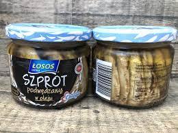 Шпроти в олії Losos ustka 250 г Польща с/б Шпроти копчені в олії від відомого польського виробника Losos Ustka (Лосос Устілка) — це прекрасне поєднання дивовижного смаку та високої якості. Під час виготовлення продукту компанія працює за європейськими стандартами, що дає змогу зберегти також усі корисні властивості. Шпроти в поєднанні з особливою олією, дадуть змогу із легкістю приготувати розкішні страви та бутерброди. Вони добре поєднуються з овочами, твердим сиром і зеленню. З їхньою допомогою можна виготовити прекрасні закуски до святкового столу. Склад: кілка копчена (район вилову: Балтійське море) 70%, ріпакова олія 30%, сіль. Енергетична цінність: 1308 кДж / 316 ккал жири: 28 г, зокрема насичені жирні кислоти 4,6 г вуглеводи: 0 г білки: 16 г сіль: 0,95 г Пропонуються шпроти в оливі від ТМ Losos Ustka в зручній скляній банці по 250 г.