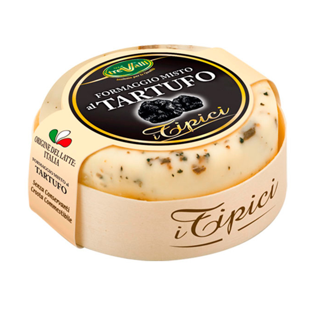 Сир напівтвердий з чорним трюфелем Trevalli Formaggio Misto al Tartufo 180г Італія Trevalli Formaggio Misto al Tartufo – це напівтвердий італійський сир, виготовлений з суміші коров’ячого і овечого молока з додаванням вкраплень чорного трюфеля (мінімум 2%). Сир відрізняється кремовою текстурою, насиченим грибним ароматом та відсутністю консервантів. У складі лише натуральні продукти: пастеризоване коров’яче та овече молоко (100% італійське), чорний трюфель (tuber aestivum), сіль, сичужний фермент та молочнокислі закваски.