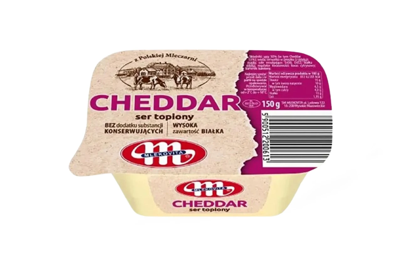 Сир плавлений Чедер Mlekovita Cheddar 150г Польща Плавлений сир у стаканчиках — категорія, що найбільш динамічно розвивається в сегменті плавлених сирів. Сири «Млековіта» відрізняються неповторним смаком, який обумовлений унікальним рецептом та використанням інгредієнтів найвищої якості. Завдяки цьому ніжний, вершковий плавлений сир, що легко намазується, доступний у стаканчиках по 150 г, ідеально відповідає потребам широкого кола споживачів.