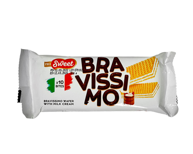 Вафлі з молочним кремом PRO Sweet Bravissimo 50г Італія Хрусткі вафлі з подвійним шаром молочного крему. 10 штучок у практичній упаковці. Наші вафлі не містять консервантів, барвників та гідрогенізованих жирів. Тільки інгредієнти без ГМО.