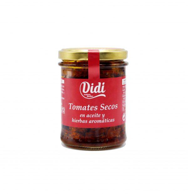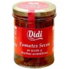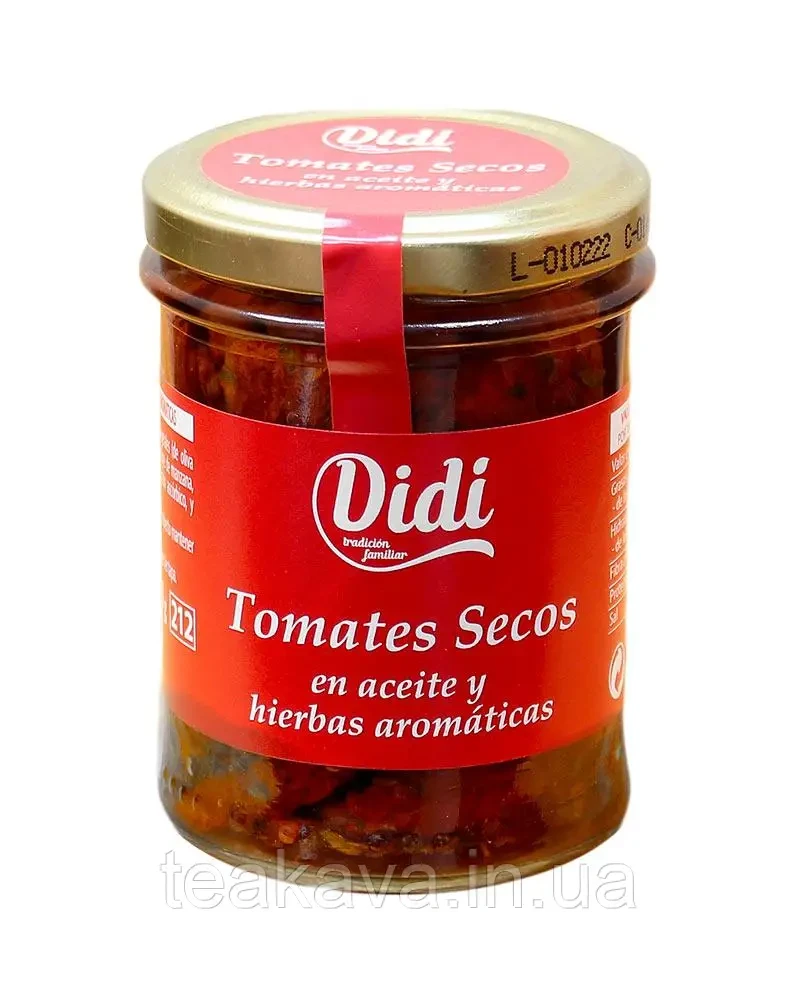 Вяленые помидоры в масле с ароматными травами Didi Tomates Secos 190г Испания Вяленые помидоры Didi со специями. Продукт изготовлен по рецептам средиземноморской кухни очень популярен по всей Европе. Такая закуска идеально дополнит любое холодное блюдо: мясо и колбаса, сыр и салаты, а также подойдет к горячим блюдам: пицце, соусам и жареному мясу. Вяленые помидоры можно подать просто как закуску, или добавить их в любое блюдо. Лучше всего помидоры подходят для приготовления салатов. Они отлично гармонируют с разными продуктами и не перебивают их вкусовых качеств. Также помидоры наполняют салаты особым ароматом. Очень хорошо этот продукт дополняет первые и вторые блюда, закуски и запеканки. Вяленый помидор имеет натуральный выраженный цвет, благодаря чему готовое блюдо будет играть яркими красками. Помимо самих помидоров для приготовления кулинарных шедевров можно использовать и масло, в котором они находятся. Масло идеально подойдёт для соусов и заправок. На его основе можно приготовить пасту для сэндвичей. Также подойдёт масло для мяса, рыбы и салатов. И помидоры, и растительное масло в любое блюдо вносят пикантность и определенные изюм. Помидор – отличный овощ, который всегда славился своим божественным вкусом. Мы сушим их на лучах солнца, а затем обрабатываем, только когда они впитают весь аромат позднего летнего солнца. Оставленные в воде для смягчения и регидратации они затем сушатся и приправляются чесноком и орегано, оливковым маслом первого холодного отжима и щепоткой соли и сахара.