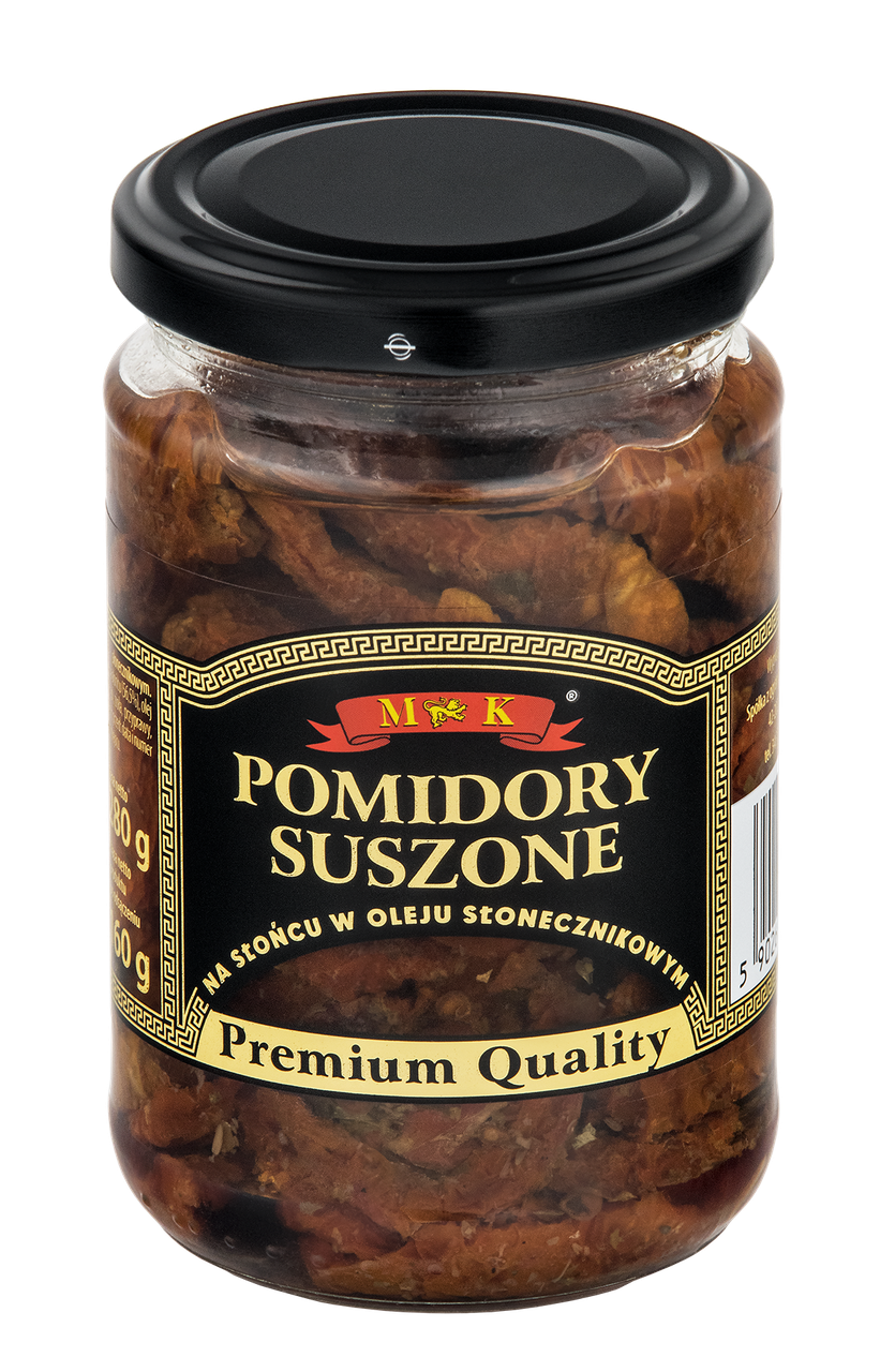 В’ялені помідори на виноградній лозі в олії MK POMIDORY SUSZONE 280г Польща преміум якість Томати багаті вітамінами (В1, В2, В6), С (це найвищий), Е, РР, К, мінерали (натрій, калій, магній, кальцій, марганець, залізо, мідь, цинк, фосфор, фтор, йод) і бета-каротин. Вони є також джерелом волокна і lipokenu. Lipoken є потужним антиоксидантом і допомагає запобігти раку простати і шлунково-кишкового тракту. Тому що організм поглинає його краще в компанії жиру, висушені на сонці помідори в олії цінним ресурсом. Їжа помідори позитивний ефект на зовнішній вигляд шкіри, покращує травлення, знижує ризик розвитку ішемічної хвороби серця і зміцнює імунну систему.