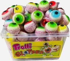 Желейні цукерки очей (ПІШТУЧНО) Trolli Німеччина 19г Жутко смачно. Trolli Glotzer з кислою начинкою — справжній шок із погляду зовнішнього вигляду та смаку. З їхніми різнобарвними зіницями здається, що вони дивляться на вас. Якщо ви досить сміливі, щоб відкусити один із штучних справжніх фруктових очей, зроблених із мармеладних цукерок, на вас чекає суперкисла рідка начинка. Індивідуально запаковані желейні очі викликають у дітей приємні мурашки по спині.