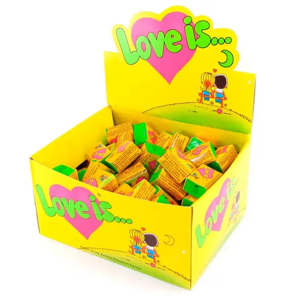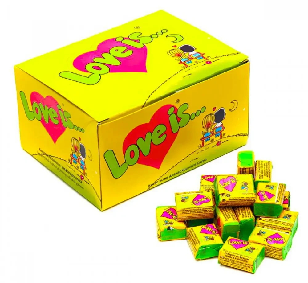 Жувальна гумка зі смаком кокосу та ананасу Love Is 400г Туреччина Легендарна жувальна гумка 90-х, яка порадує не лише дитину, а й дорослого своїм “смаком дитинства”. Крім оригінального вигляду має неймовірний аромат та смак. У блоці 100 жувальних гумок із вкладишем усередині.